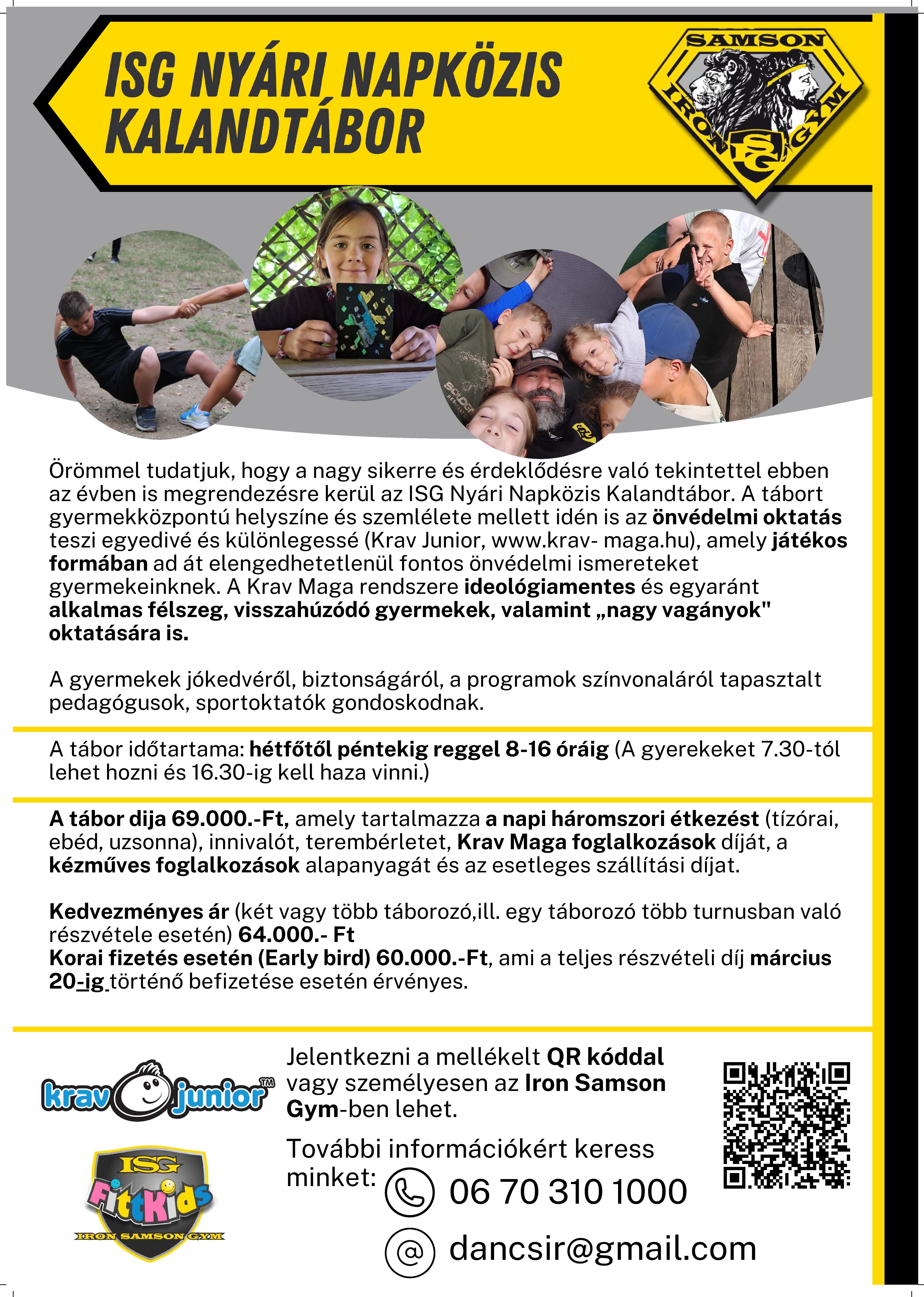 Kedves Szülők, kedves Gyerekek, kedves Fiatalok! Örömmel tudatjuk, hogy a nagy sikerre való tekintettel immár 21. éve, idén is megrendezésre kerül az ISG Nyári Napközis Kalandtábor. A tábor különlegessége idén is az övédelmi oktatás (Krav Junior; www.krav-maga.hu) lesz, amely játékos formában ad át elengedhetetlenül fontos önvédelmi ismereteket gyermekeinknek. A Krav Maga rendszere ideológiamentes és egyaránt alkalmas félszeg, visszahúzódó gyermekek, valamint „nagy vagányok" oktatására is. „Míg Apu és Anyu dolgozik, Te szerezz élményeket!" Sportolj, erősödj, okosodjál, érezd jól magad! Regisztráni az alábbi linkekre kattintva lehetséges a következő időpontoka: https://forms.gle/E27JzZiyFgSSWyVZ7 2026. július 6-10. - ISG Kids Nyári Napközis Kalandtábor_I. turnus (5-10 évesek) 2026. július 20-24. - ISG Junior Nyári Napközis Kalandtábor_II. turnus (5-15 évesek) 2026. augusztus 3-7. - ISG Teens Nyári Napközis Kalandtábor_III. turnus (10-15 évesek) A 2026. július 6-10 között megrendezésre kerülő tábor elsősorban a kicsik, 5-10 évesek tábora lesz, a 2026. augusztus 3-7 a nagytinédzsereké, míg a 2026. július 20-24-re meghirdetett turnus vegyes lesz, de amennyiben a bárátok, vagy a testvér miatt nem a korosztályának megfelelő táborba szeretne jönni a gyermek, annak sincsen semmi akadálya (a tapasztalat szerint mindhárom turnus vegyes összetételű, de a meghirdetett korosztálynak megfelelően állítjuk össze a programot, úgy, hogy eltérő életkorú gyermekek is örömmel részt tudjanak venni benne.)